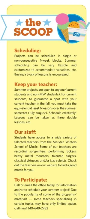 A personalized one-on-one summer music project is a powerful way to boost musicianship and enthusiasm to the next level, and is the perfect complement to other summer experiences. camp or day camp experiences.
